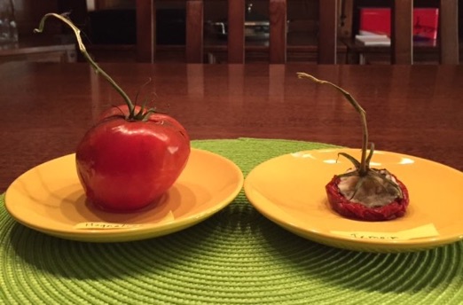 J’ai magnétisé uniquement la tomate de gauche, quatre semaines plus tard voilà le résultat .
